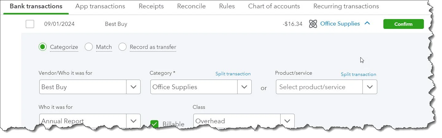 This will be less of an onerous task if you do it regularly. Open an account by clicking in the box and make sure For review is highlighted. Open each transaction by clicking it and change the Category if it’s missing or not correct. Once you’ve verified everything in the box, click Confirm.