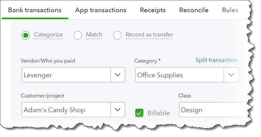 Unless you have a very small business with few transactions, you should categorize transactions every day. Accurate, thorough categorization is required so your reports and taxes are correct. Be sure to check the Billable box when it’s warranted.